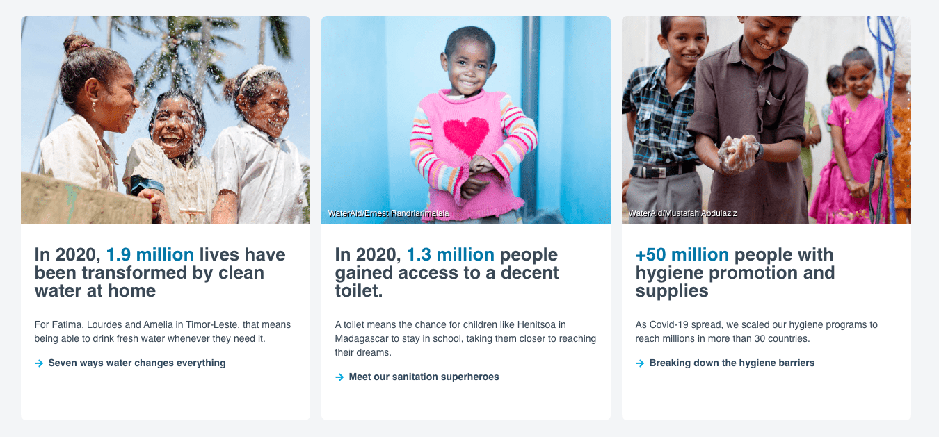 On the Why Wateraid page, everything is centered on clean water. They could focus on their other initiatives, like gender equality and generational change, but instead they keep clean water at the center.